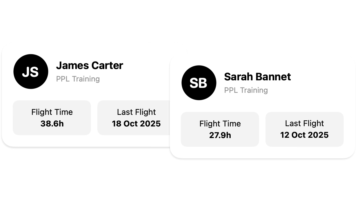 You see total time and last flight for every student at a glance. This helps you spot who falls behind early and follow up when needed.